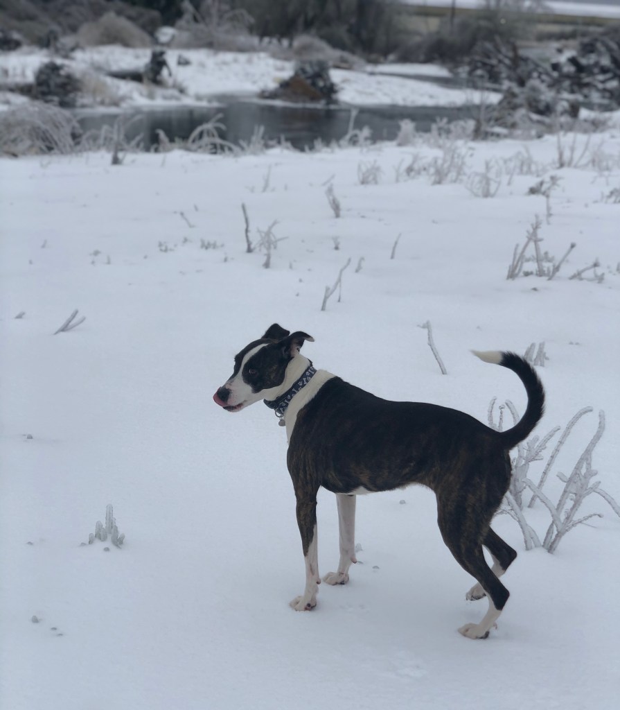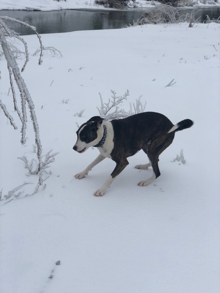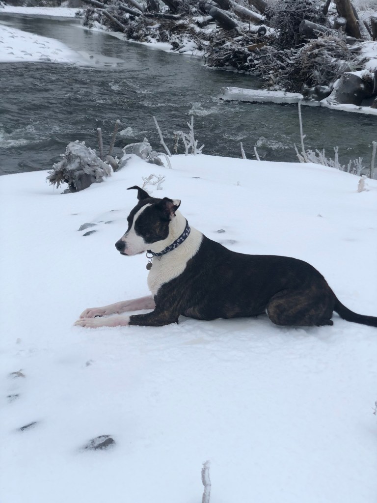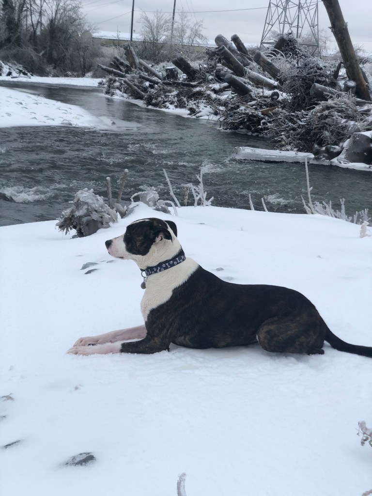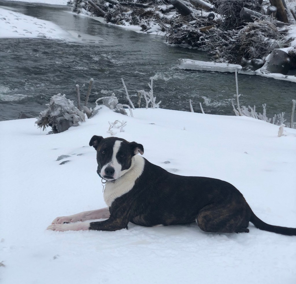 The photos above, including the feature photo, was taken at a creek Kali and I often walk to near my home. If you look closer at the photos where she’s sitting on ice, you’ll see she’s soaked in ice water. She had just jumped into the frozen creek, chasing Ducks.