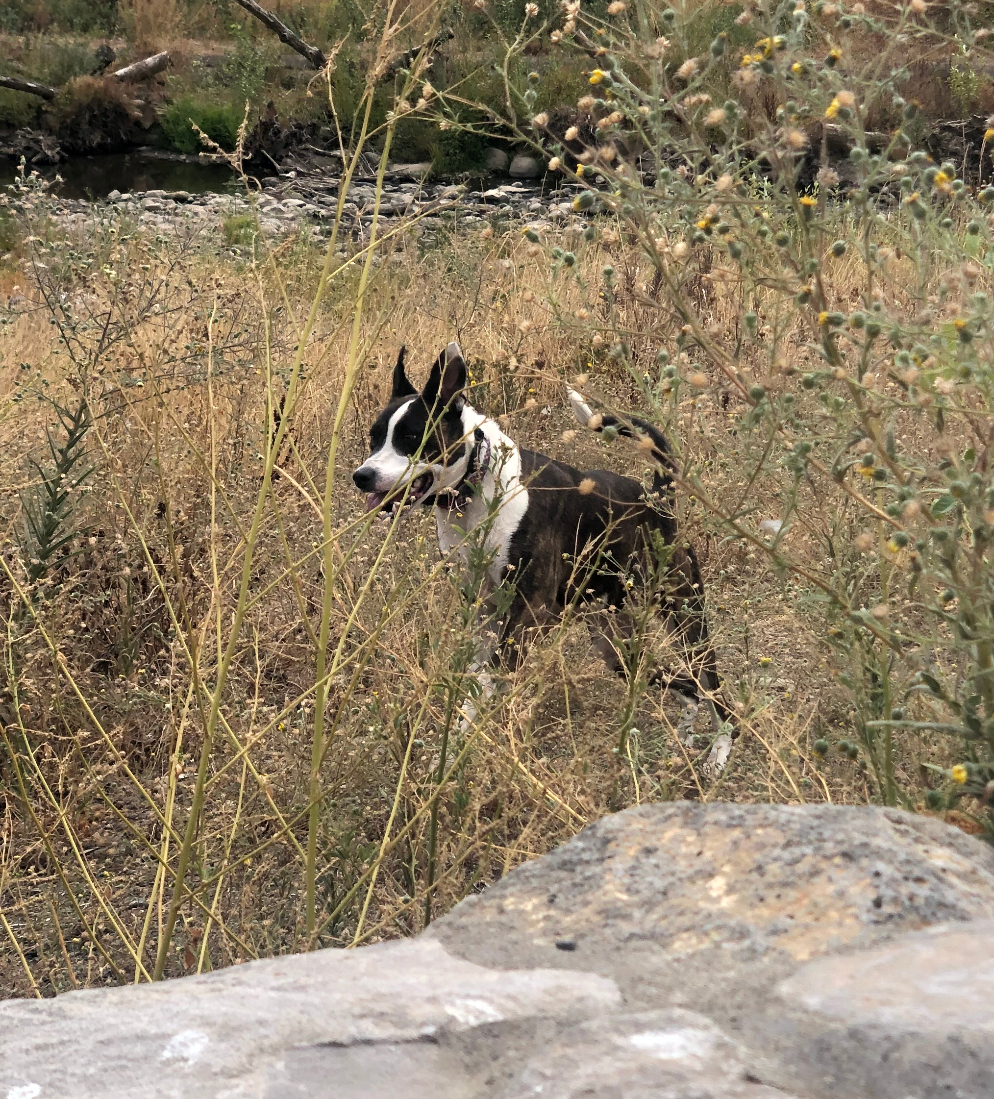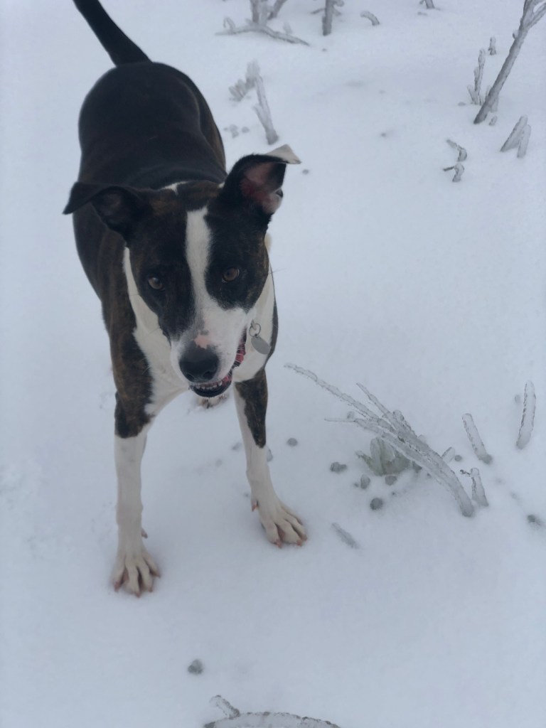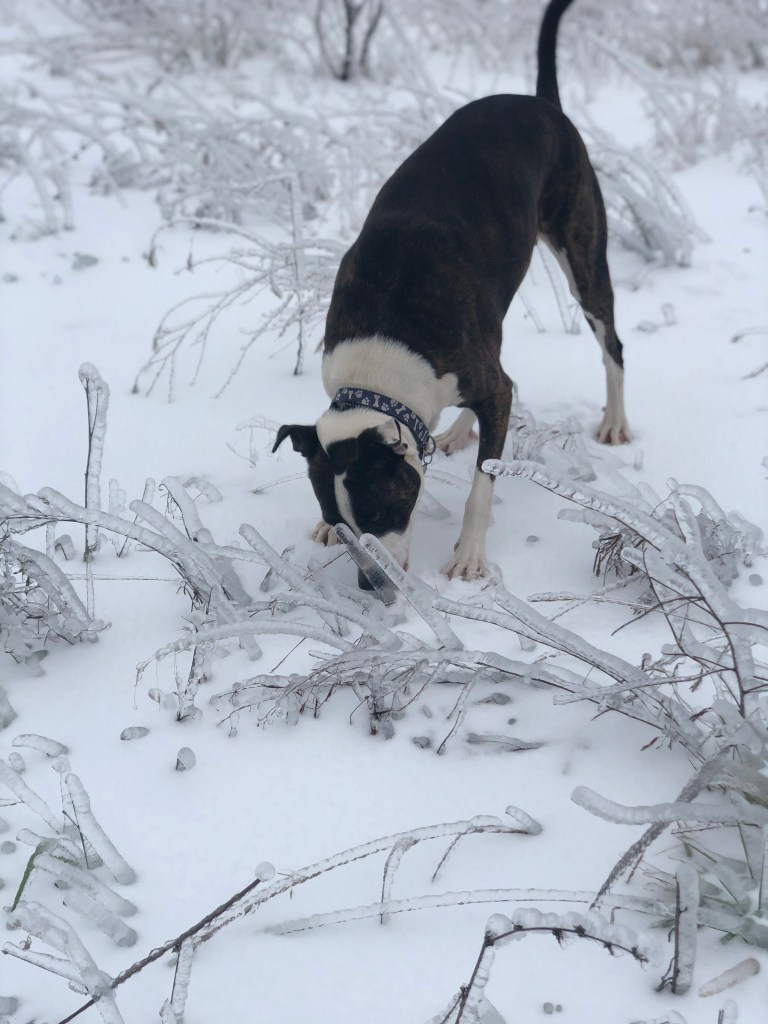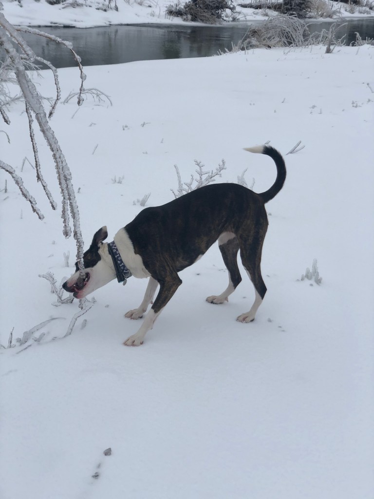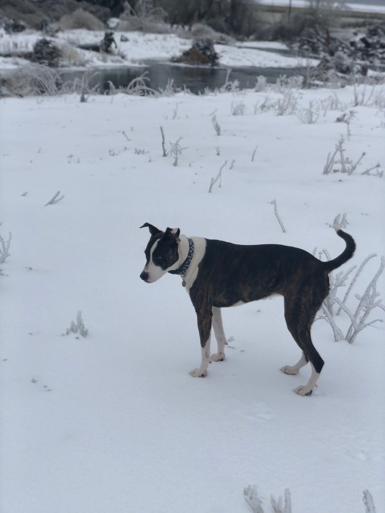 The photos above, including the feature photo, was taken at a creek Kali and I often walk to near my home. If you look closer at the photos where she’s sitting on ice, you’ll see she’s soaked in ice water. She had just jumped into the frozen creek, chasing Ducks.