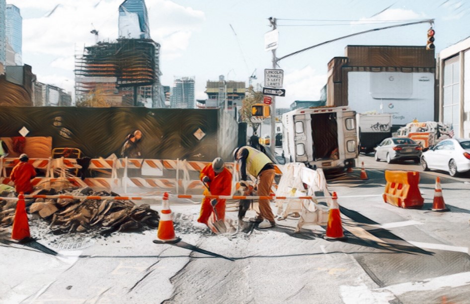 Several construction signs and yellow coned barriers surround a giant caterpillar loader full of gravel. A monstrous excavator dumps massive loads of broken-down street concrete beside an unfinished curb. A worker sidesteps a sinkhole as his fellow hard-hatted men yell at cars detouring the site. The block’s sidewalks aren’t done, and the next street over is closed. Whosoever ensures the flaggers signal appropriately is one bad verb from a tragic oops.